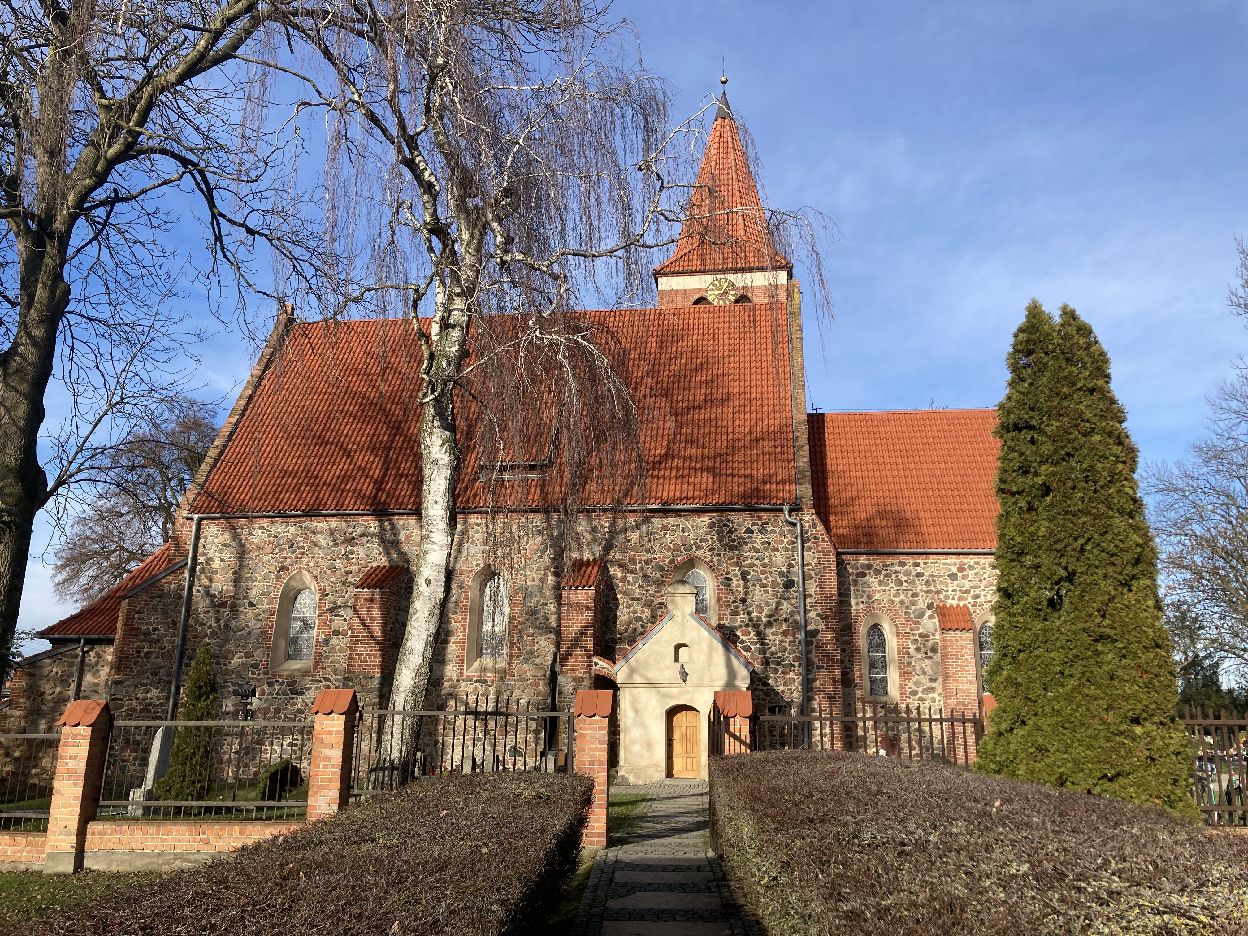 Wieś wzmiankowana jest już od XIII w. Najcenniejszym zabytkiem jest tu datowany na przełom XIII/XIV w. kościół pw. św. Katarzyny Aleksandryjskiej, jeden z najstarszych gotyckich kościołów ziemi chełmińskiej i z tego powodu zapewne dobrze znany Mikołajowi Kopernikowi. Podobnie jak inne zabytki reprezentujące tzw. gotyk krzyżacki, kościół jest zbudowany z kamienia i cegieł oraz jest jednonawowy. Na uwagę zasługuje też średniowieczne wyposażenie świątyni: ceramiczne figurki świętych z poł. XIV w., datowana na XIV w. płaskorzeźba terakotowa przedstawiająca dwugłowego jelenia, rzeźba św. Jana z XV w., rzeźba Marii z Dzieciątkiem z ok. 1500 r., a także późnogotycka ława kolatorska z XVI w.