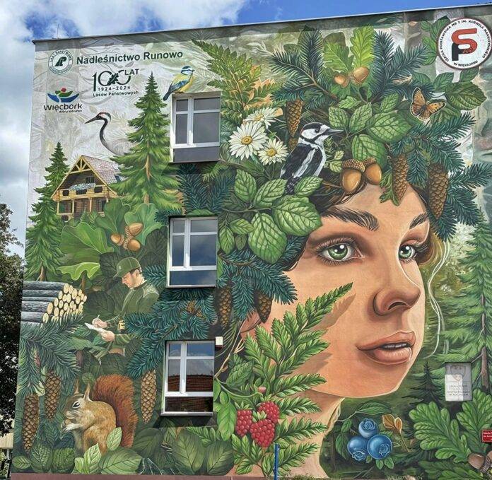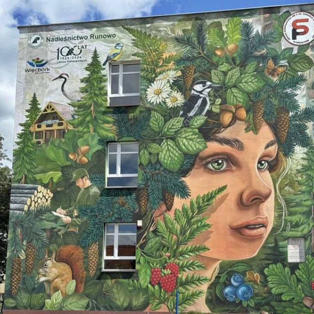 Ten mural z pewnością przyciąga wzrok każdego przechodnia. To dzieło sztuki powstało z okazji 100-lecia Lasów Państwowych, upamiętnione przez Nadleśnictwo Runowo Krajeńskie. Wyłoniony w konkursie projekt autorstwa znanego grafika Dawida Celka nosi tytuł „W jedności z naturą”, a za jego realizację odpowiadała firma Wallart. Mural to prawdziwa uczta dla oczu! Centralną postacią jest młoda kobieta, której włosy przeplatają się z liśćmi, szyszkami i leśnymi roślinami, co symbolizuje jedność człowieka z naturą. W tle można dostrzec różnorodne elementy lasu – od majestatycznych drzew, przez rozkwitające kwiaty, po skaczącą wiewiórkę i ptaki. Każdy detal jest dopracowany z ogromną precyzją, tworząc harmonijną całość. To jednak nie tylko malowidło – to przypomnienie, jak ważne są lasy dla naszego życia i jak wiele korzyści nam przynoszą. Jeśli chcesz poczuć magię i zanurzyć się w leśnej atmosferze, koniecznie odwiedź Więcbork i zobacz ten niezwykły mural na własne oczy. Kto wie, może odnajdziecie w nim coś, czego wcześniej nie dostrzegliście?