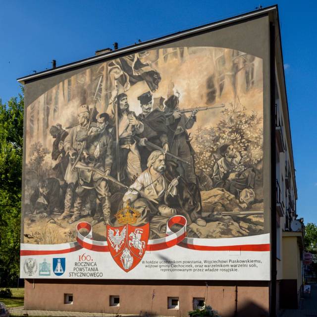 Na ścianie bloku przy ul. Broniewskiego 4, powstał mural upamiętniający 160-lecie Powstania Styczniowego. Projekt autorstwa Dominiki Sikorskiej i jej zespołu to hołd dla bohaterów przeszłości, takich jak warzelnicy soli oraz wybitny wójt Wojciech Piaskowski. Obraz inspirowany jest słynnym rysunkiem Artura Grottgera pt. "Bitwa". Malowidło łączy historyczną symbolikę z nowoczesną formą. Dzięki współpracy z lokalnym stowarzyszeniem artystka zrealizowała swoje marzenie o pracy w rodzinnym mieście, tworząc dzieło, które zachwyca i inspiruje mieszkańców oraz turystów.