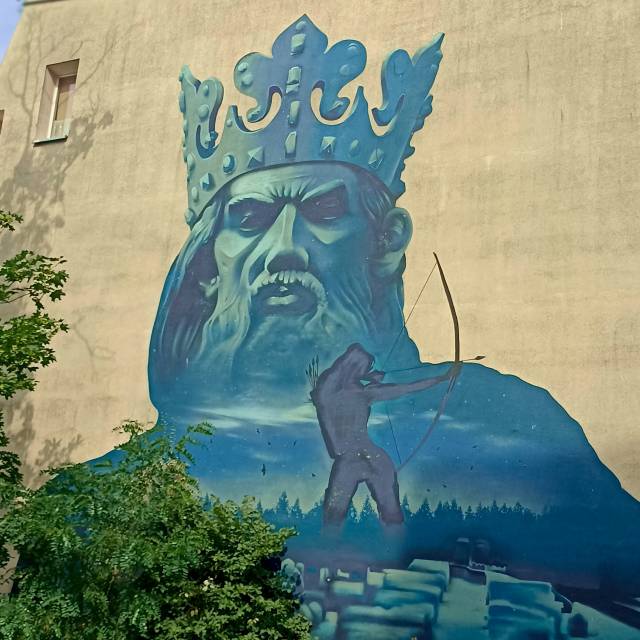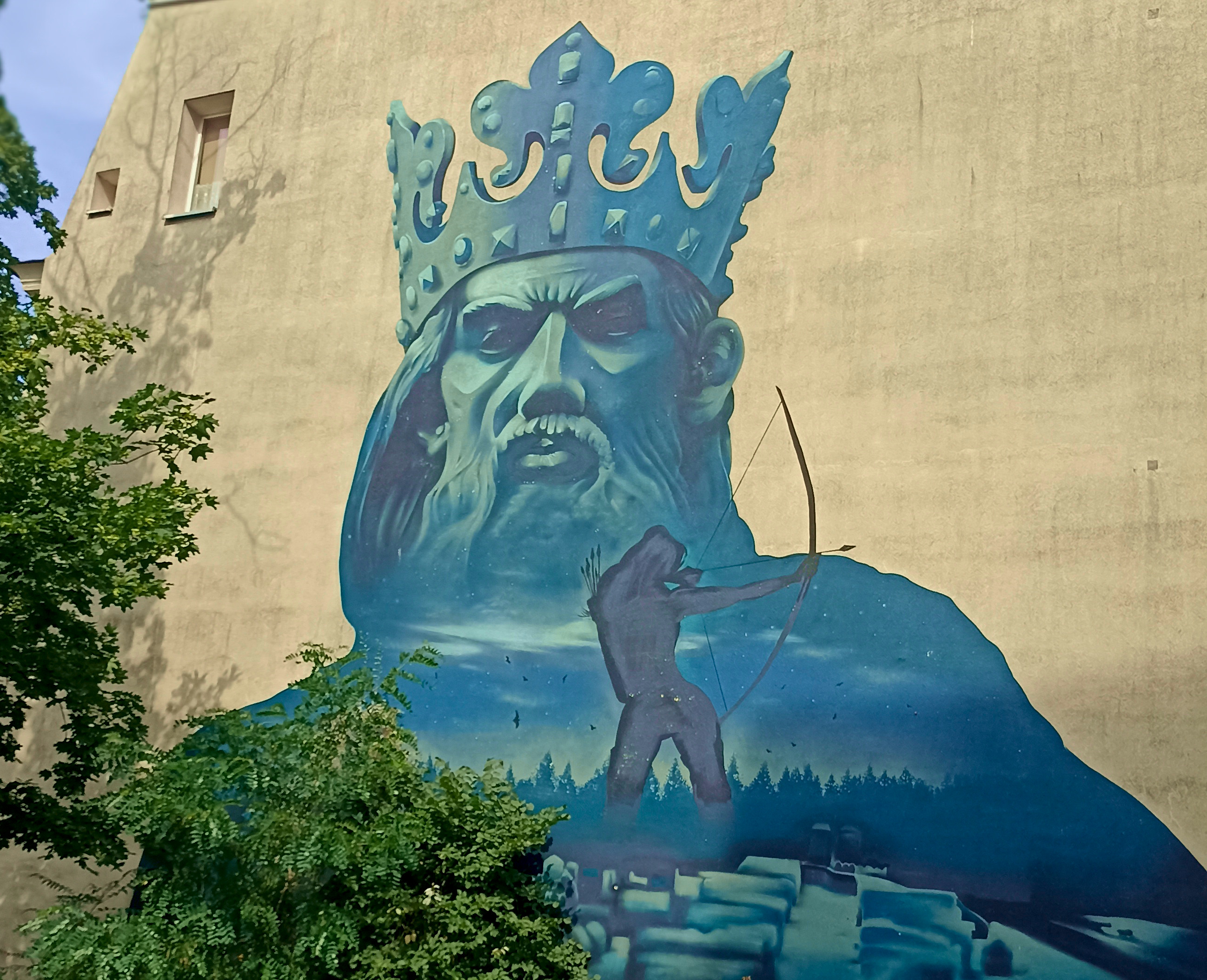 Dominującą postacią jest Kazimierz Wielki, jeden z najlepszych władców Polski. To on nadał Bydgoszczy w 1346 roku prawa miejskie i dzięki niemu powstał tutaj zamek – choć zamku już nie ma, pamięć o królu trwa. Kazimierz Wielki, który "zastał Polskę drewnianą, a zostawił murowaną", jest ukazany na tle osady. Na muralu widnieje rownież postać łuczniczki, symbolu Bydgoszczy. Namalowane dzieło przypomina, jak wielkie znaczenie miało jego panowanie dla rozwoju miasta. Ten mural to nie tylko sztuka, ale i hołd dla historii.