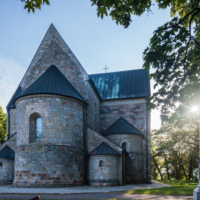 Kościół zbudowany jest z ciosanego granitu i piaskowca. Jego wschodnia fasada tworzy ciekawą kompozycję pięciu półokrągłych absyd różnej wielkości. Ścianę południową zdobią trzy romańskie portale. Portal północny, zwany wrotami śmierci, jest zamurowany. Dawniej wynoszono tędy ciała zmarłych na przykościelny cmentarz. Masyw zachodni w dolnej części romański, posiada nadbudowaną późnogotycką wieżę. Na zewnętrznych murach świątyni odnaleźć można romańskie ryty o niewyjaśnionym pochodzeniu. W ścianie południowej widnieje znak w formie plecionego krzyża, przypominający swastykę. To tzw. „wirujący krzyż”, będący znakiem chroniącym chrześcijan przed szatanem.