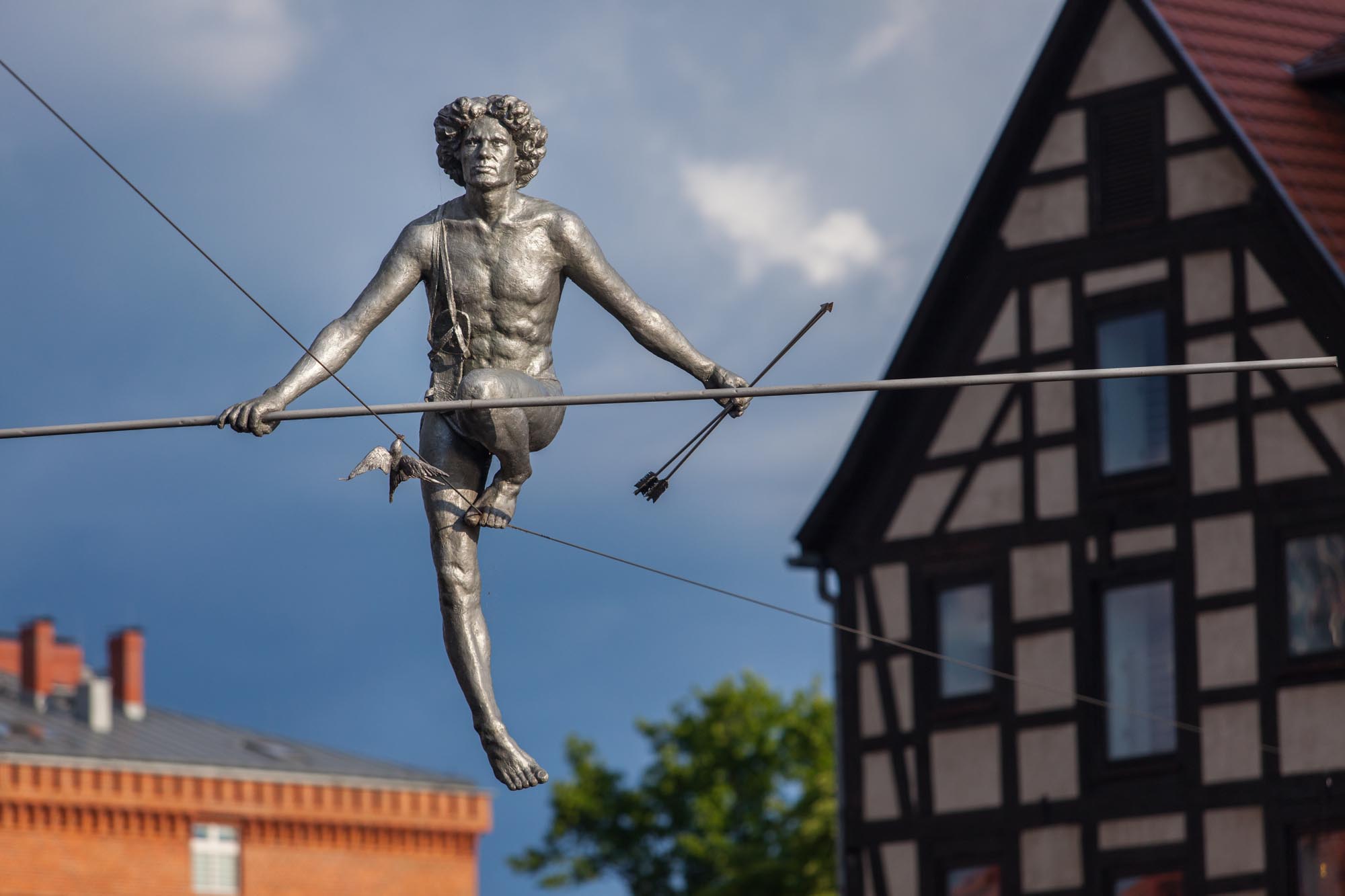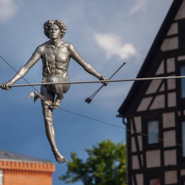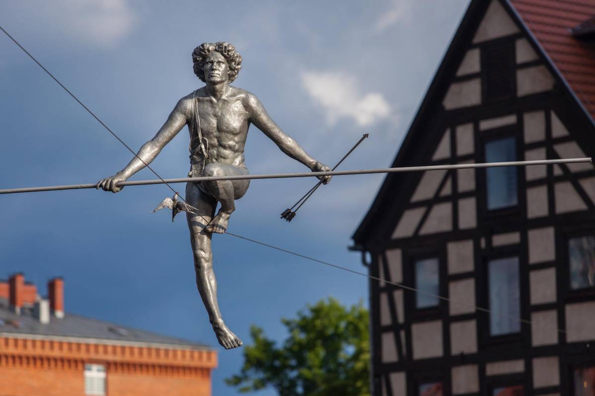 The sculpture "A Man crossing the River," balancing on a rope stretched between the two banks of the Brda, has become a city symbol. It appeared in Bydgoszcz on May 1, 2004, to commemorate Poland's entry into the European Union. What keeps the "Crosser" suspended above the water for so many years? The secret lies in shifting the center of gravity below the level of the rope, allowing the sculpture to maintain balance. Next to the "Crosser" on the rope, you’ll also notice a swallow (in German, schwalbe). This is a nod to Andrzej Szwalbe, a prominent Bydgoszcz citizen and the founder of the Pomeranian Philharmonic. The sculpture’s was made by Jerzy Kędziora.