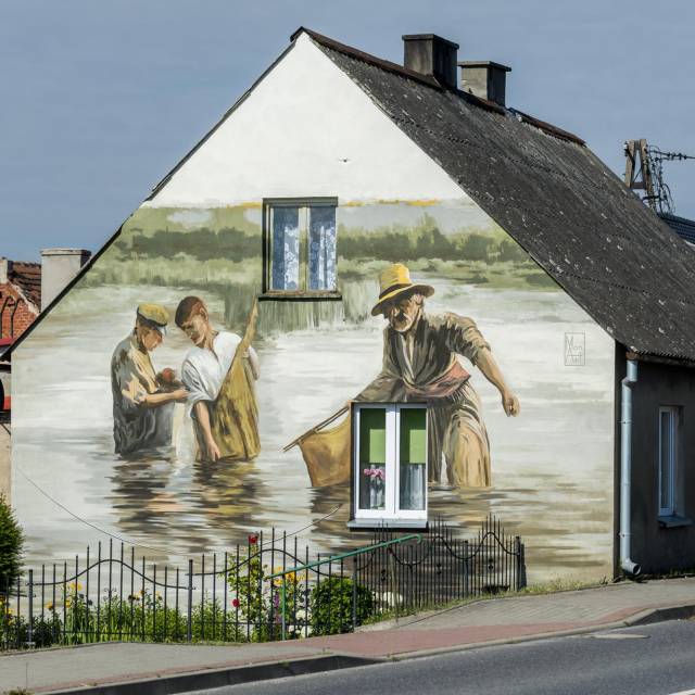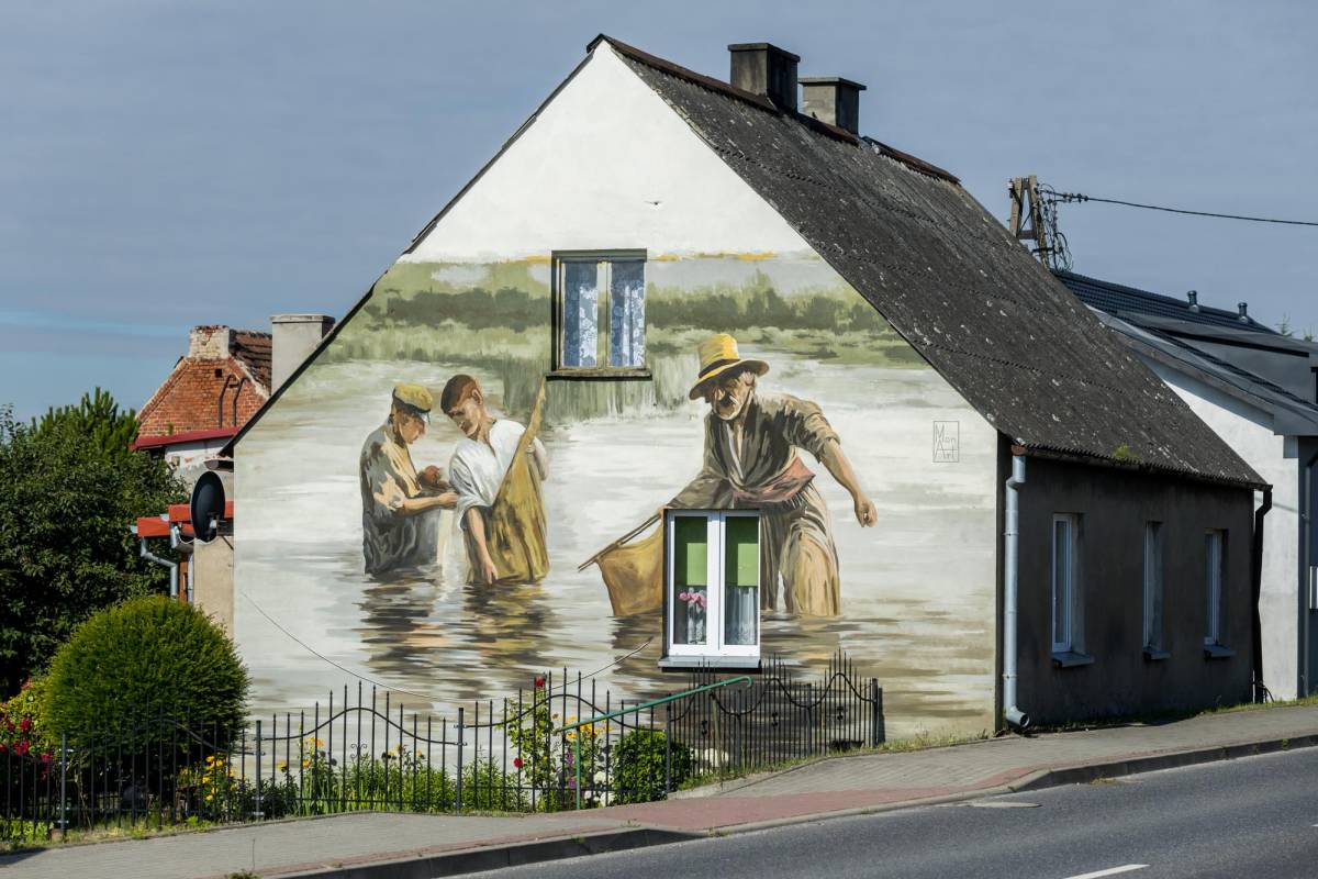 The mural not only commemorates the local history of fishing, but also promotes the charming surroundings of the Noteć River and Lake Wolickie. Wyczółkowski's "Fishermen" motif fits perfectly into this theme, capturing the life and work of the inhabitants of this place, who have been associated with the Noteć River for centuries. The painting realistically depicts the everyday life of fishermen. It is not only an artistic decoration, but also a reminder of the culture and traditions of the inhabitants of Knieja.