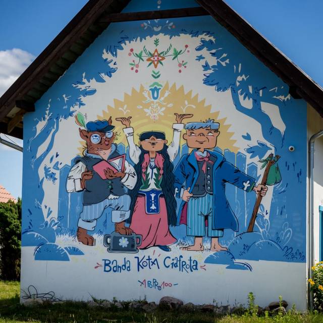 "Ciafrotowo" comes from the Kociewie word "ciafrotać," which means to talk a lot. It is a place created for joint creation, conversation, and inspiration. Andrzej Poprostu, inspired by characters created by local children, transferred them onto the walls of the building. Each character from Banda Kota Ciafrota has a story to tell.